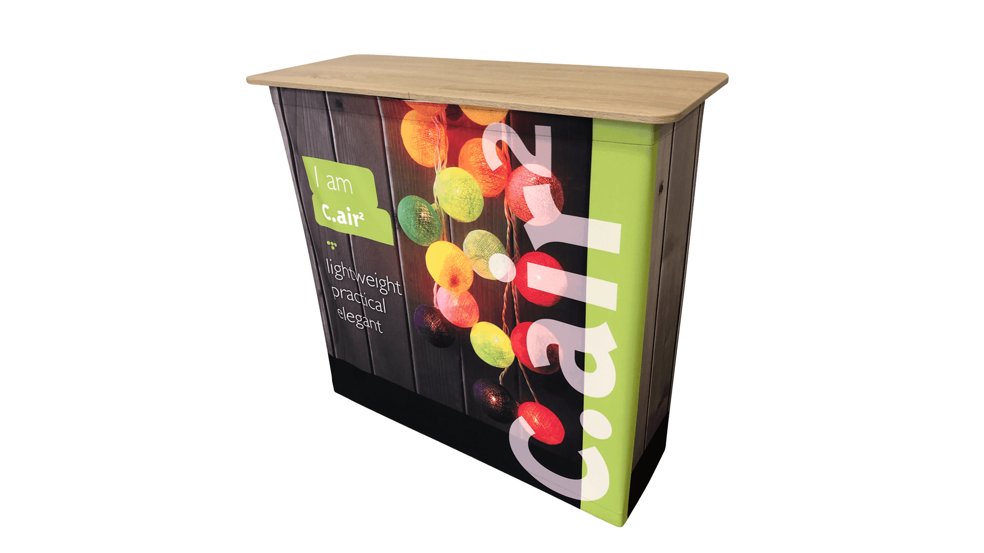 Dépliez la structure avec le visuel pré-monté, attachez les bords du visuel, posez le plateau de comptoir et les étagères.